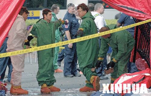 在美国佛罗里达州的杰克逊维尔市,从发生爆炸的尤尼森工业公司走出的救援人员接受辐射检查