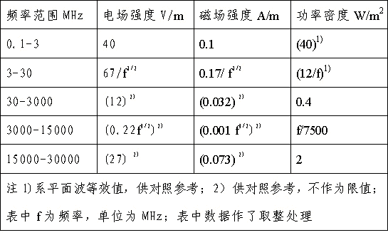 4、对于脉冲电磁波,除满足上述要求外,其瞬时峰值不得超过表中1、2所列限值的1000倍。